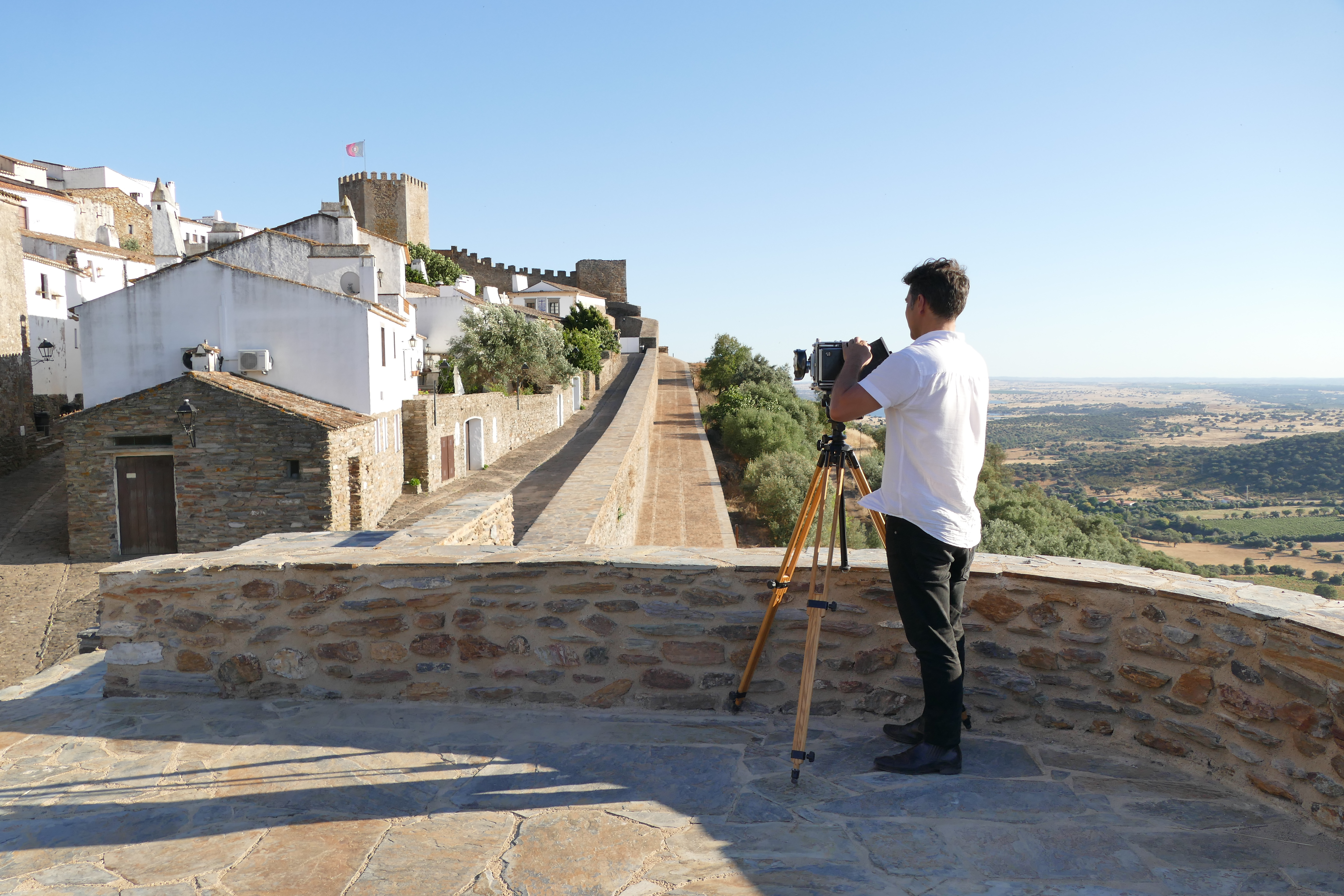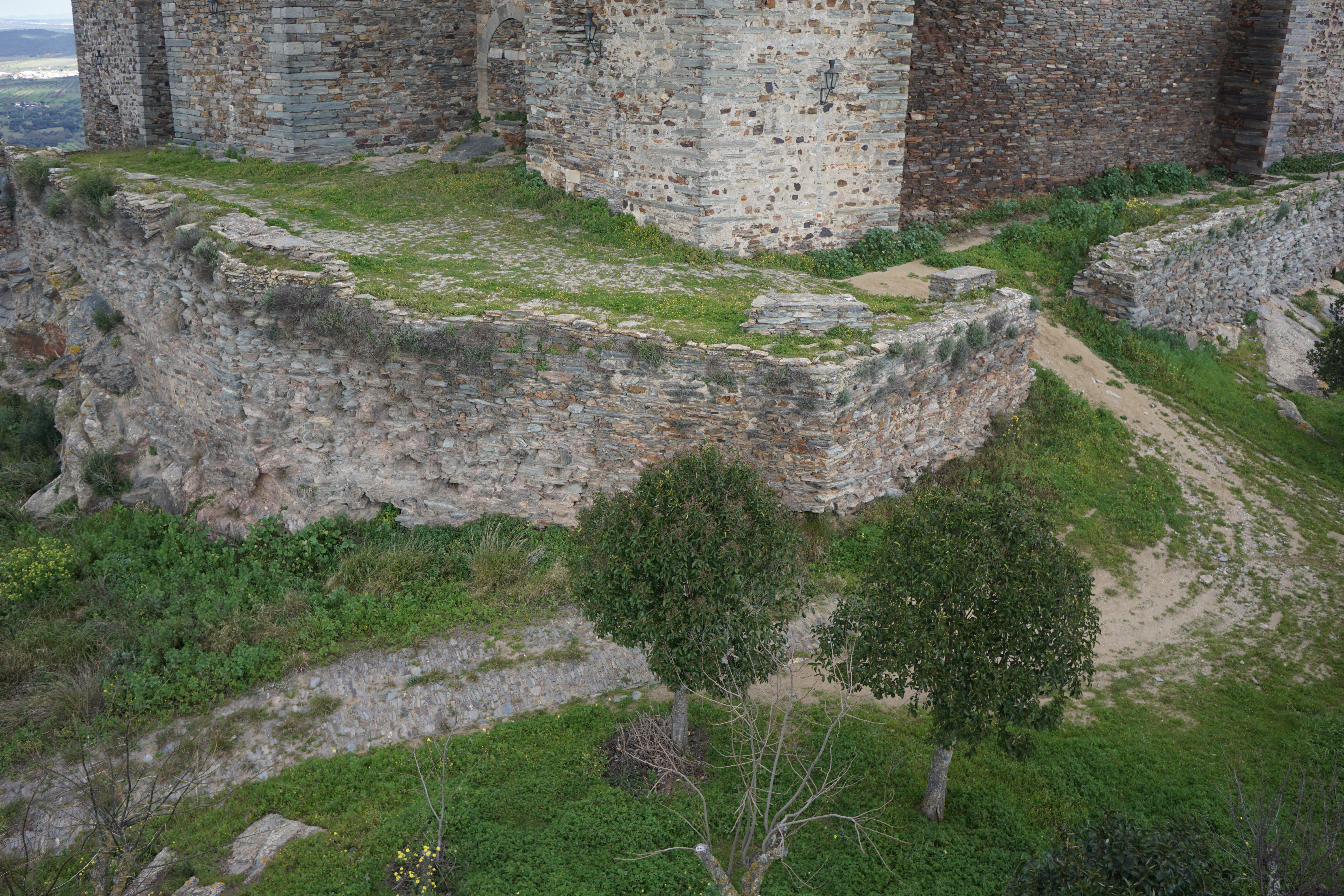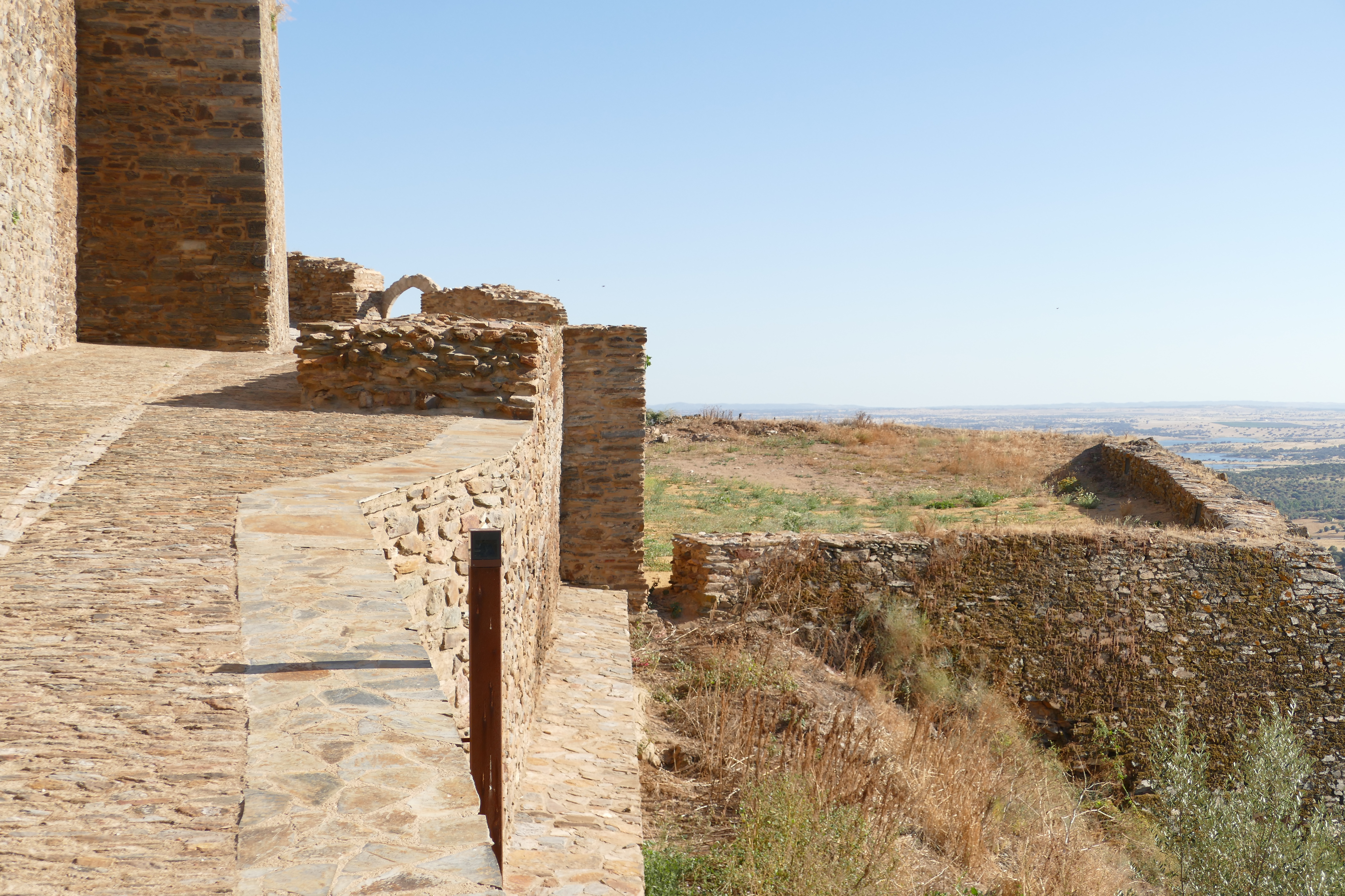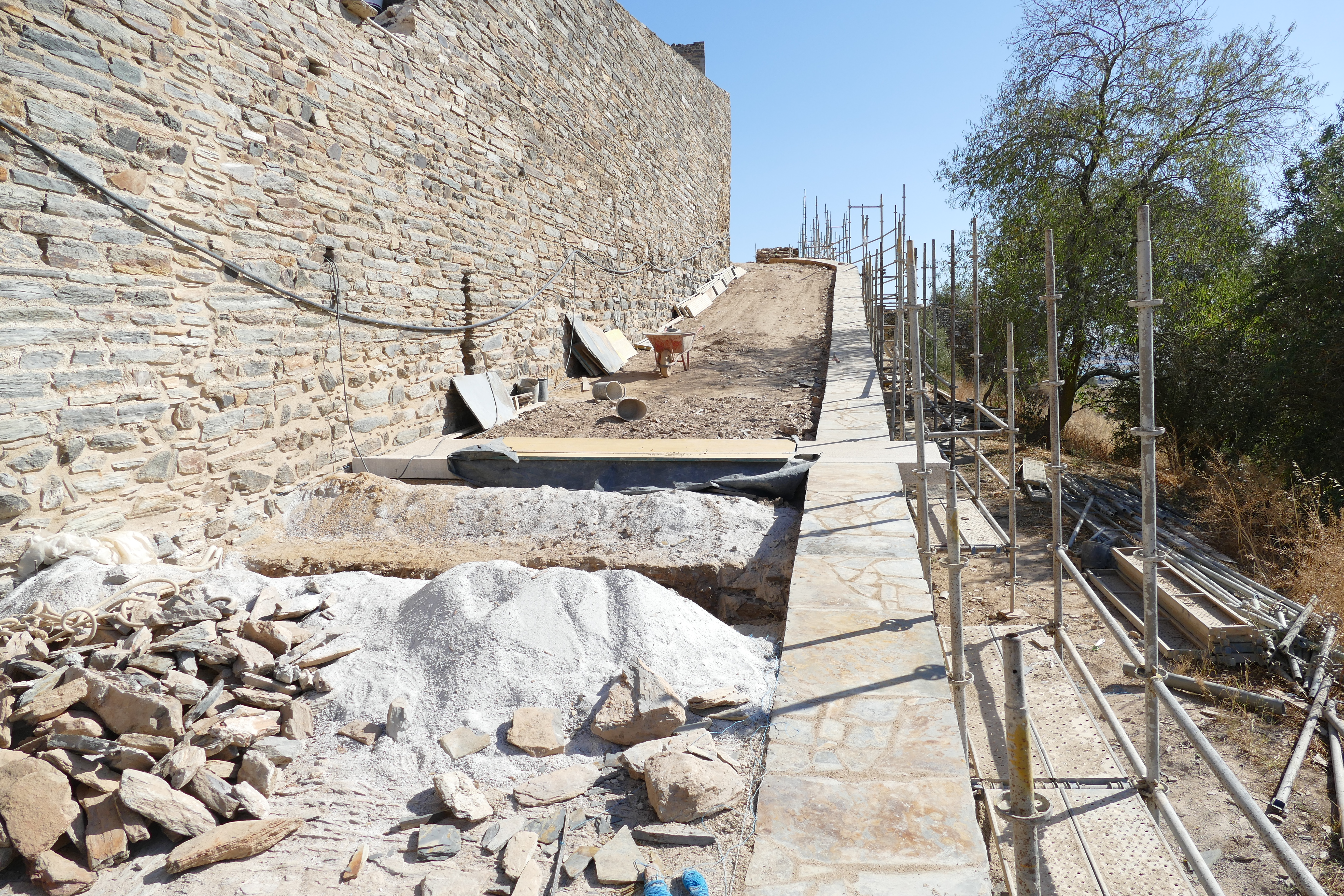 The redefinition of the Barbican path along the curtained escarpment seeks to stabilize its old route and restore the continuity of transition between the territory, the extraordinary cultural landscape to the west and the walled town of Monsaraz. The restoration of this route in traditional schist paving, allows to consolidate the transition between the vertical plane of the wall, in apparent schist masonry, and the horizontal plane defined by the path and the rocky escarpment where the village of Monsaraz is located.