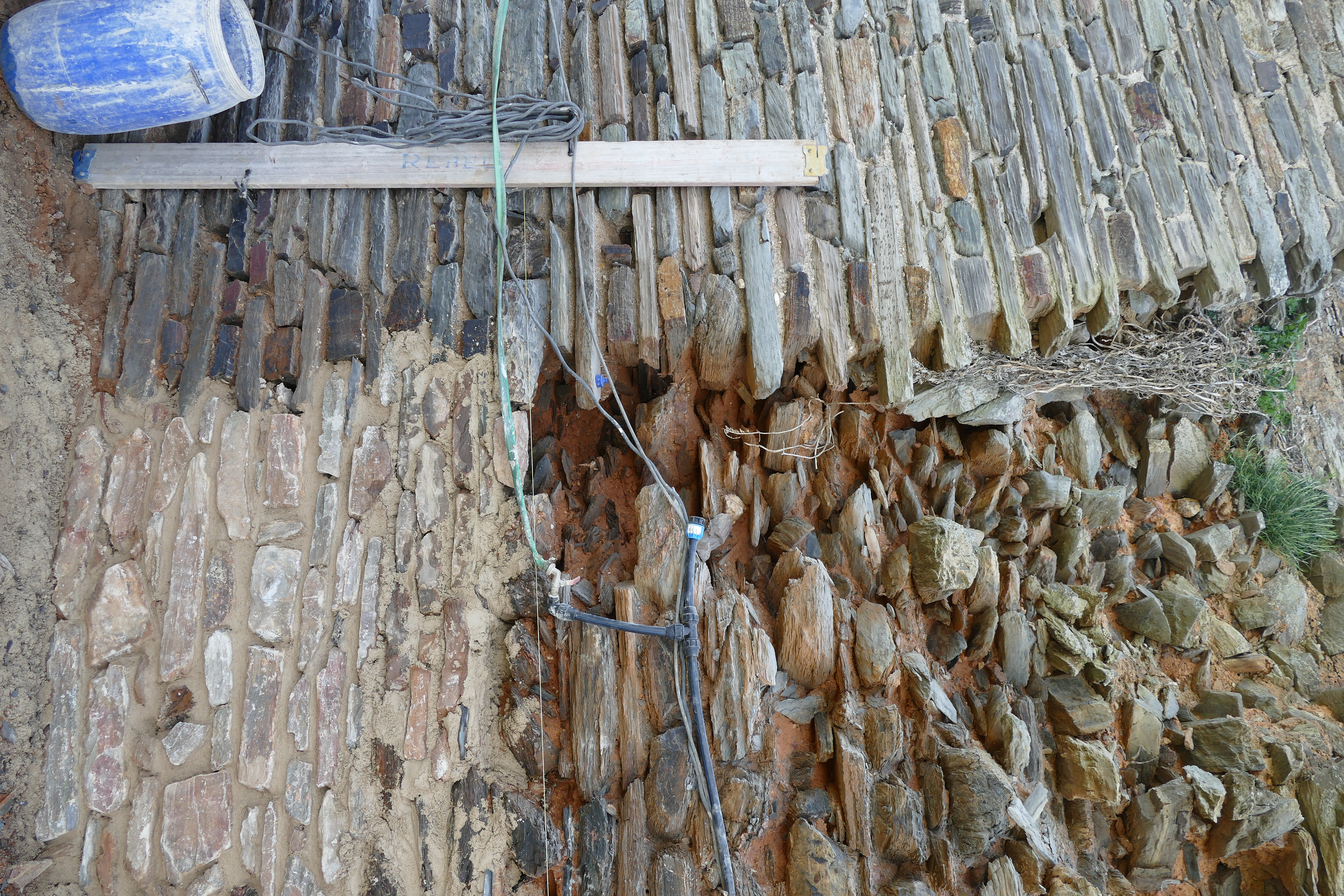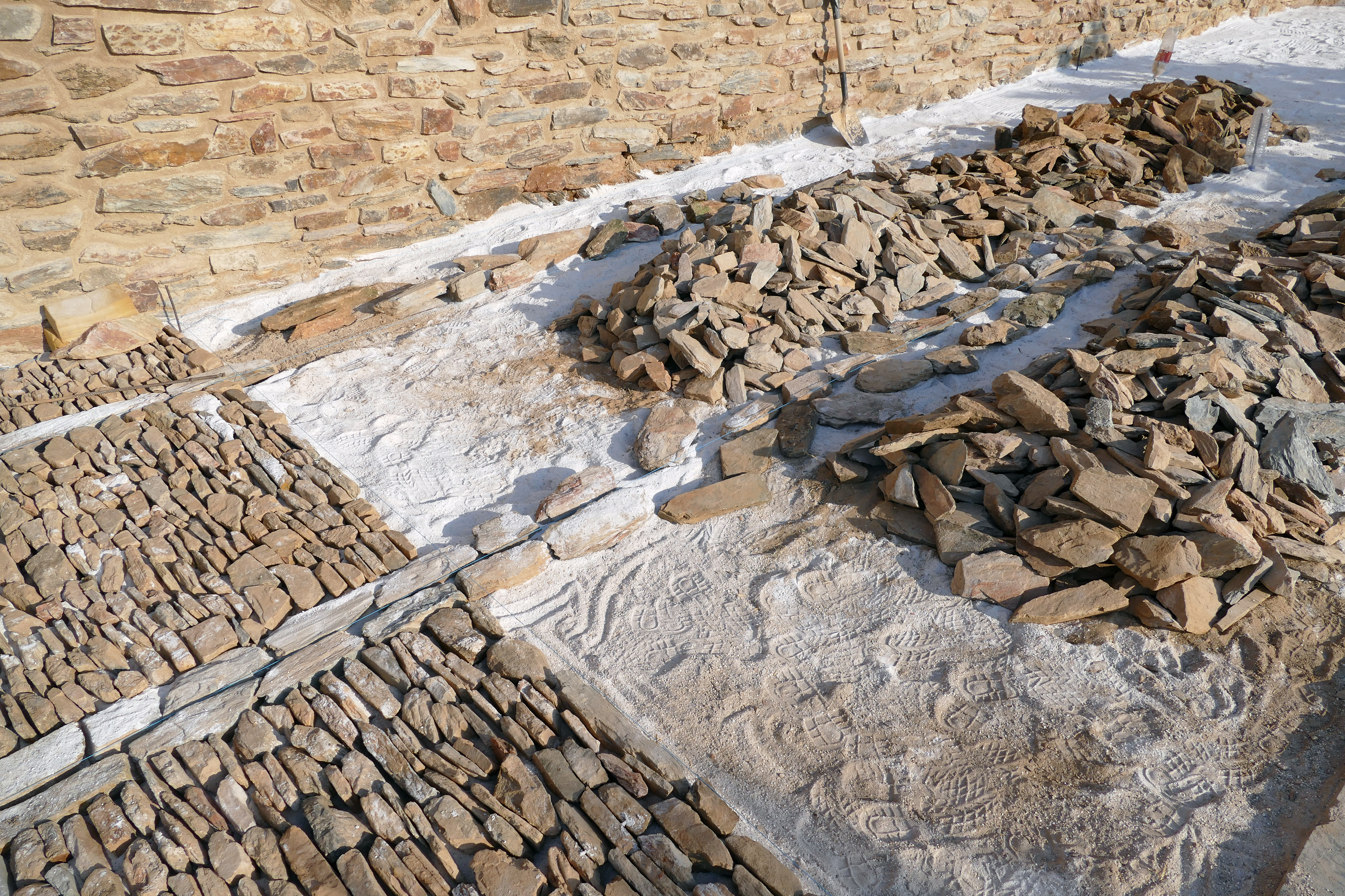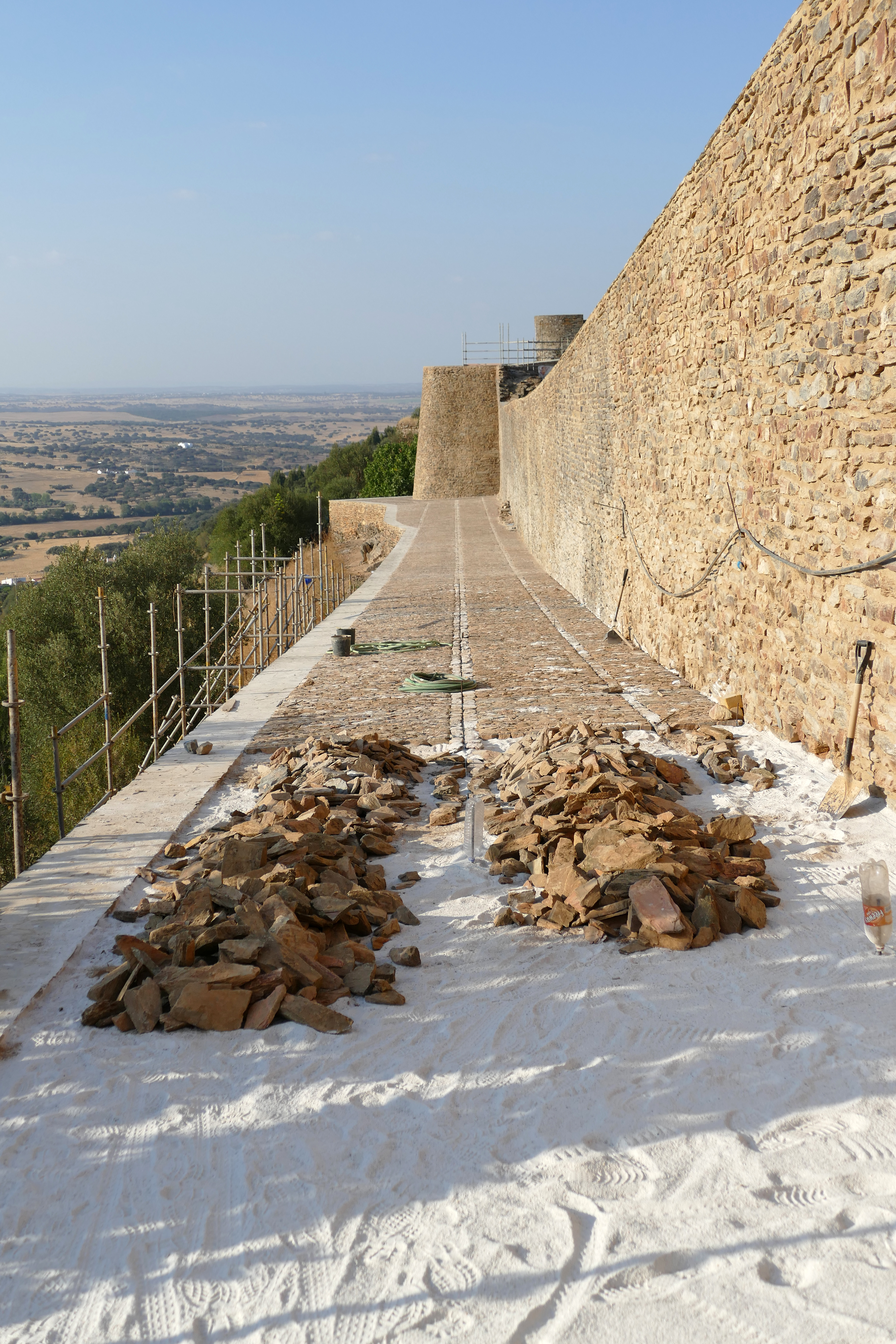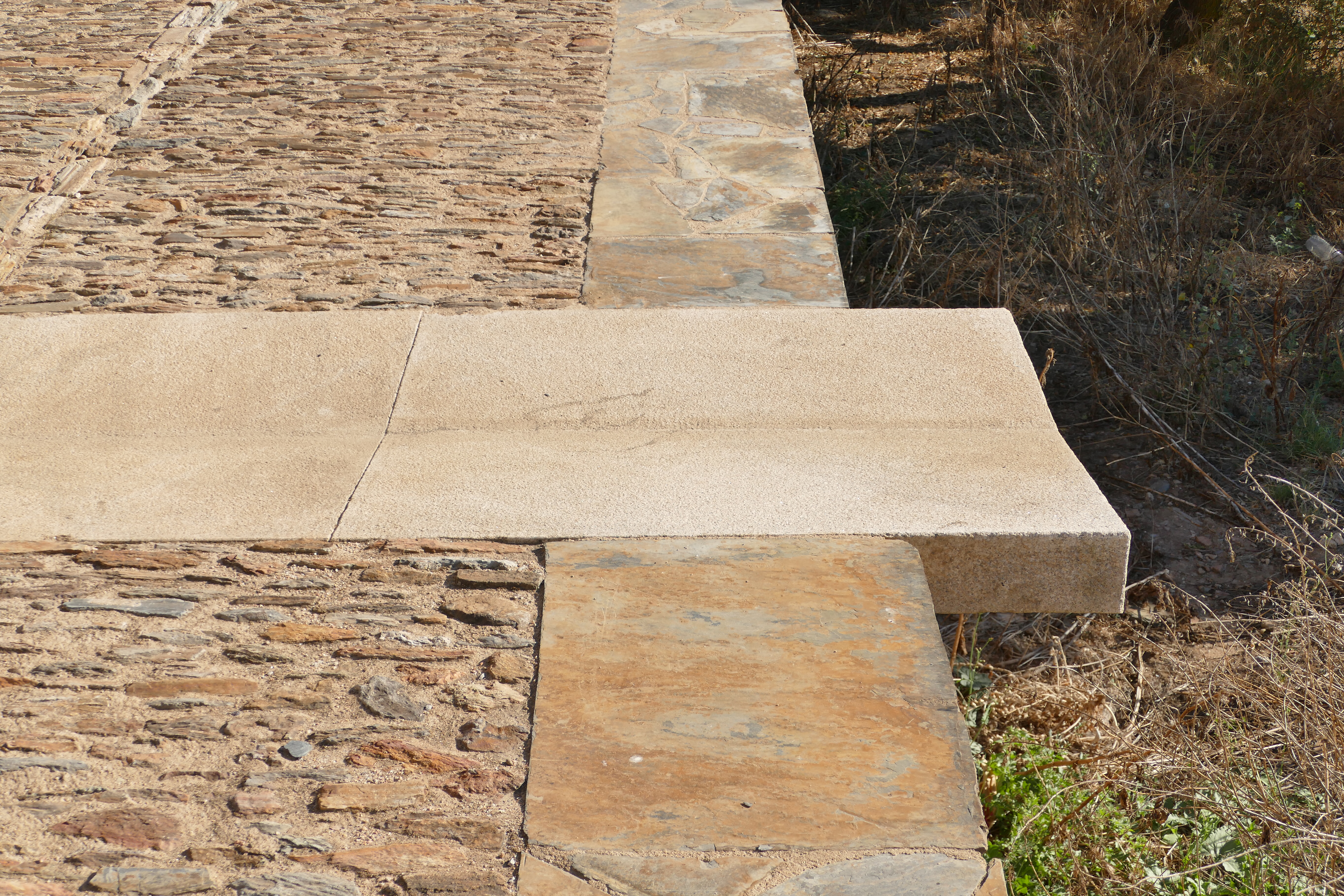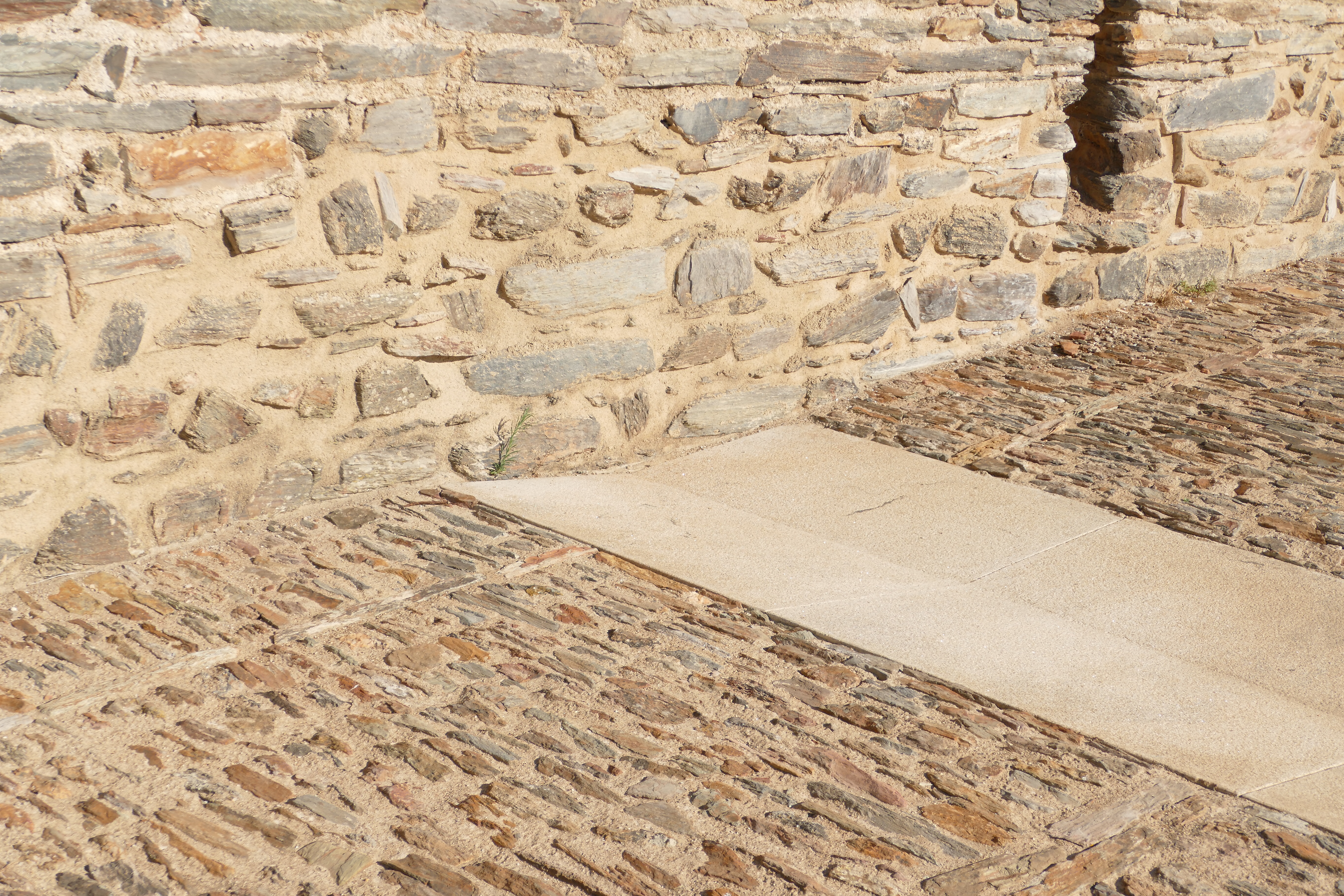 The schist pavements of Monsaraz are one of its hallmarks and also represent a complex system for the conduction of rainwater, based on the structure of guides that draw the water's path. All the specific interventions now proposed for the floors of Monsaraz seek to continue this system, optimizing the flow of water to the outside of the walls. As is the case with the Restoration of the wall section of the roundabout.