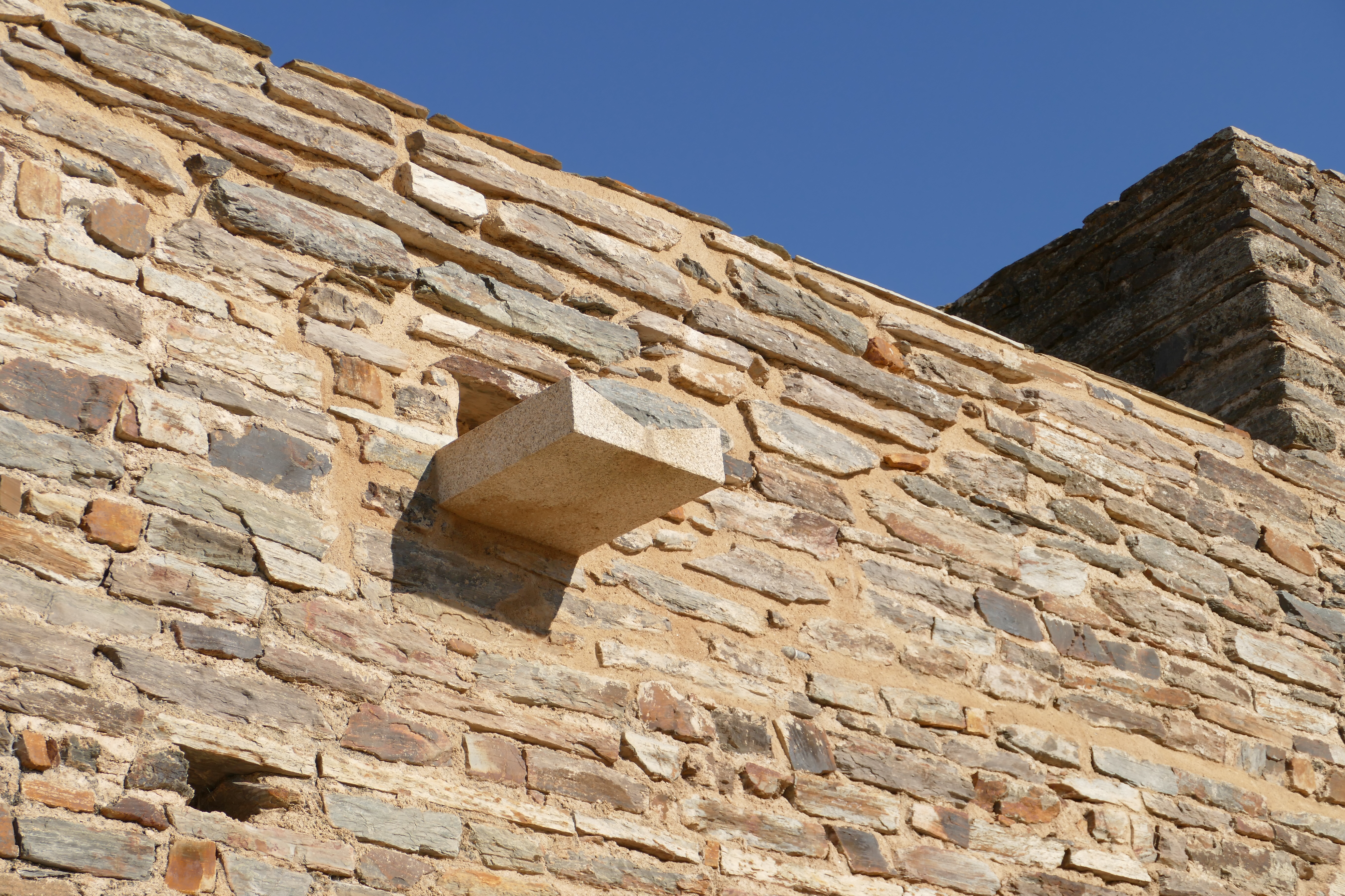 At the end of the important drainage channel of Travessa Quebra-Costas, it is proposed to give architectural expression to the existing gargoyle, which seems to be insufficient for the flow that this artery supports, transforming it into a piece of granite, integrated into the wall, which projects the rainwater to another lower gargoyle, which collects the water at the level of the Barbacan path (a significant part of the population between this area and the festoon line drains to this point) and leads it to a natural flow downstream. This piece gives expression to a critical point of the Monsaraz drainage, formalizing an element that is also exceptional. The objective is to ensure that the rainwater runoff is optimally conducted to the outside of the walls, without causing erosion of the paths and walls of the wall.