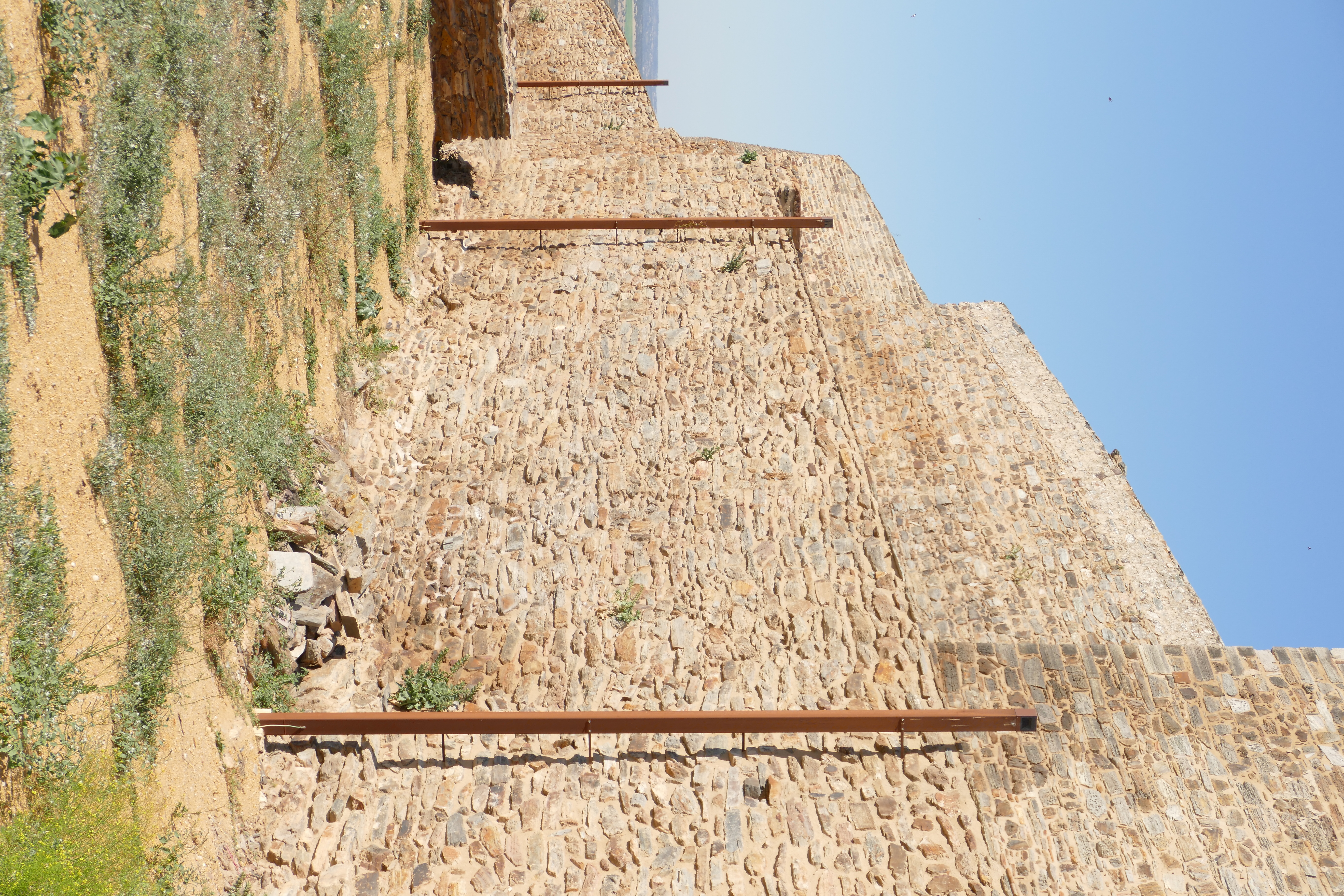 The occasional use of corten steel elements, as external material, is used only in situations of transition between Barbacã and the outside of the wall, characterized by the vertical elements that define the lighting and by the external staircase to the wall and connecting the Porta da Traição to the Revelins that add to the topography. In the transition between the fortification and the landscape, the oxide color of the corten steel is linked to the colors of the terrain.
