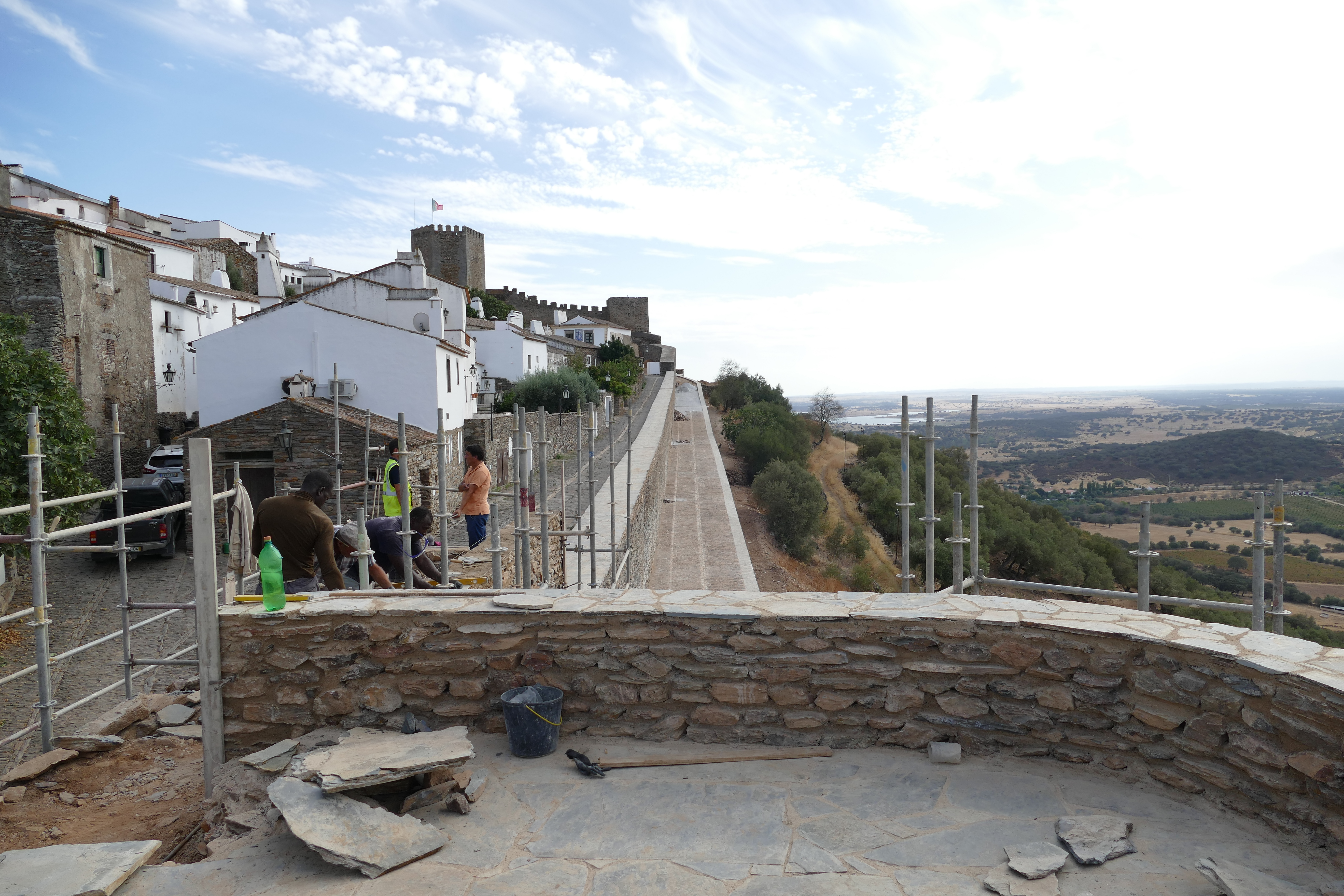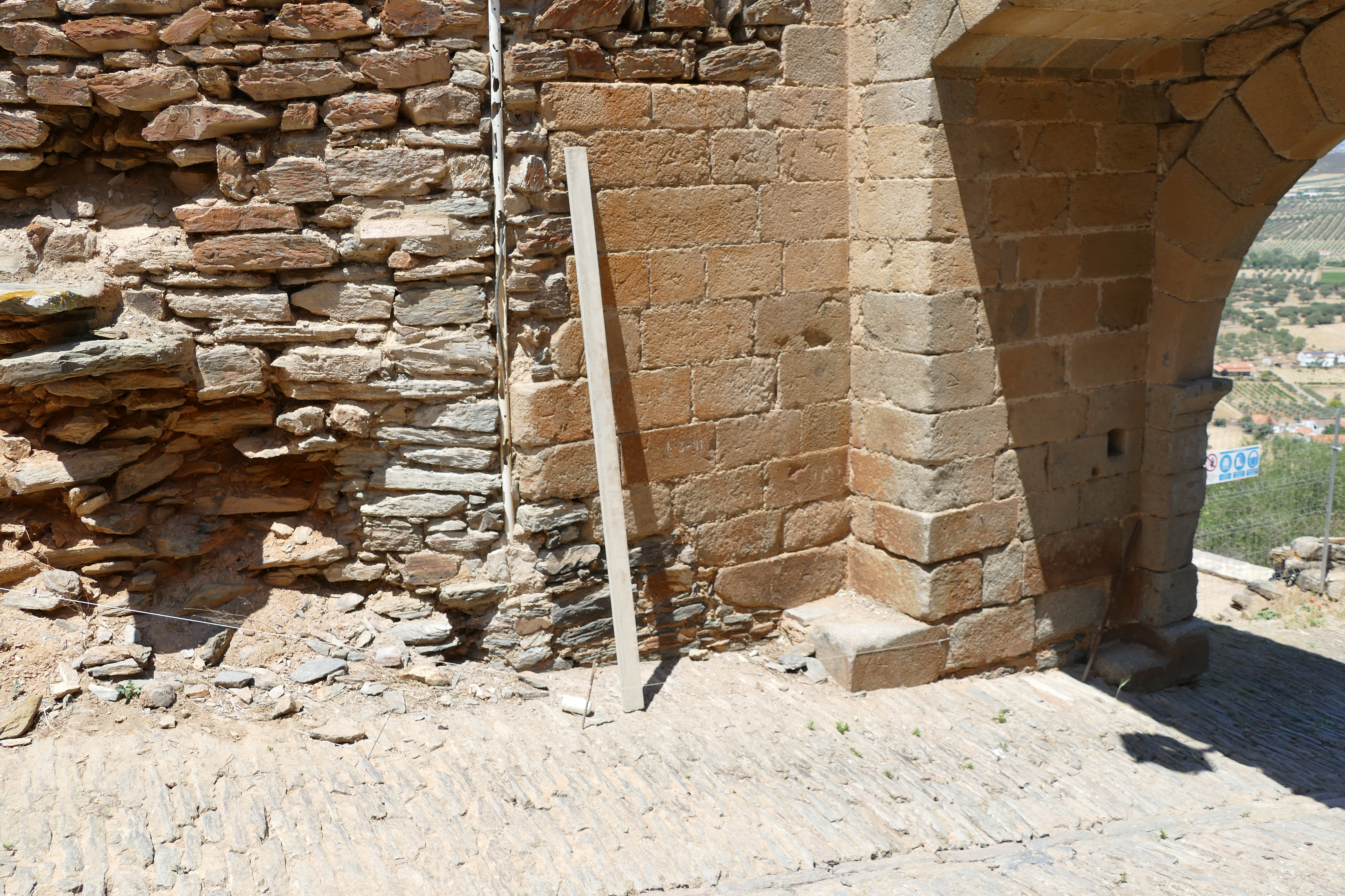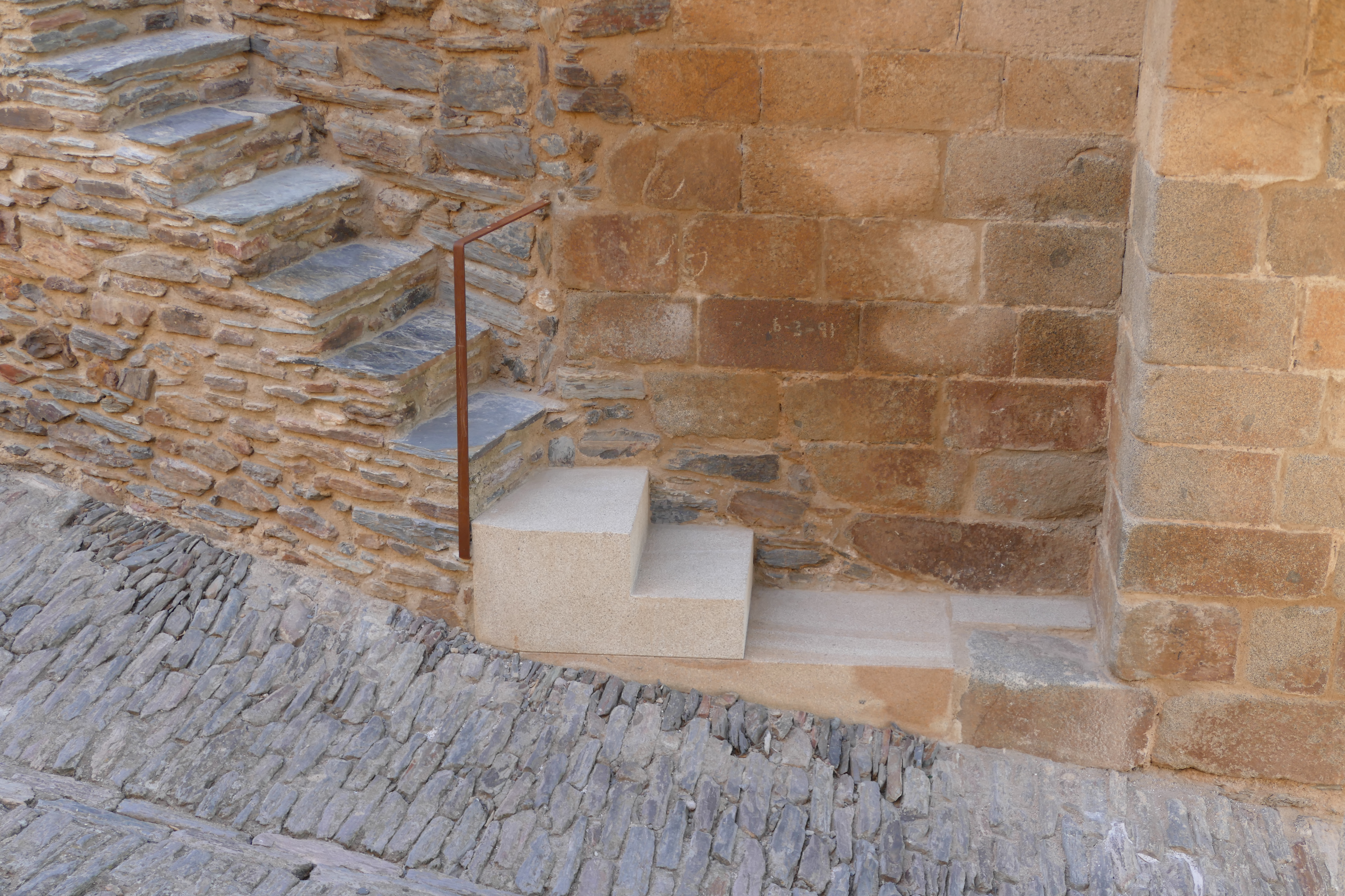 In conjunction with the structural consolidation work of the walls of Monsaraz and in particular the interior of the opening of the wall next to the Porta de Évora, the reconstruction and consolidation of this staircase in schist masonry was carried out, guaranteeing the restoration of its previous shape in an essential and simplified design. Once again the regularity of the equipment to be executed and the use of air lime-based mortar will allow this addition to be documented and distinguished from the original parts. The shale in the first steps is replaced by granite pieces due to resistance and durability needs.